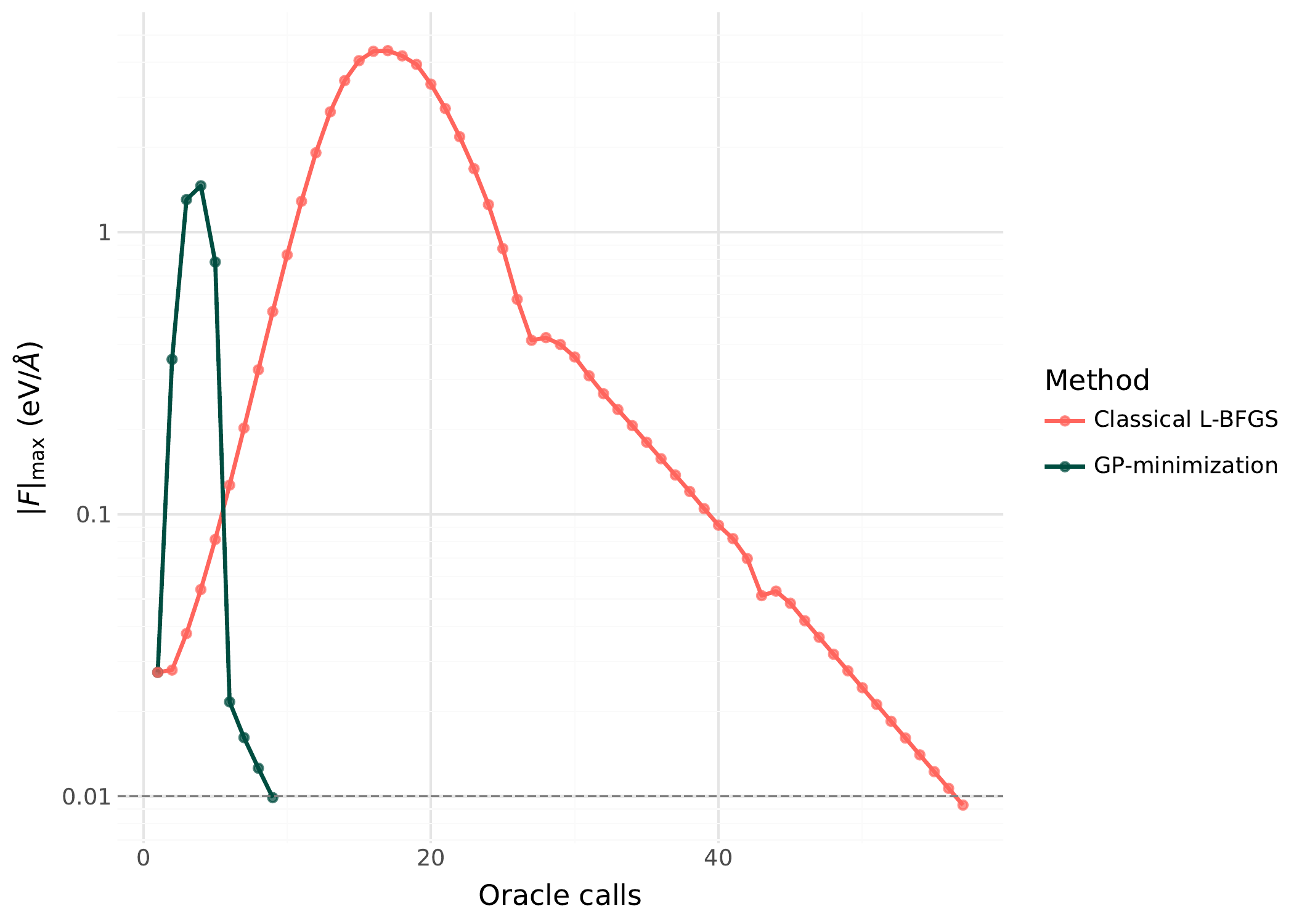 Energy vs oracle calls on the LEPS surface. GP minimization (teal) reaches the minimum in under 10 calls; direct gradient descent (coral) is still converging at 200 calls. The MolInvDistSE kernel captures the molecular invariances, giving the GP better generalization from fewer data points.¶